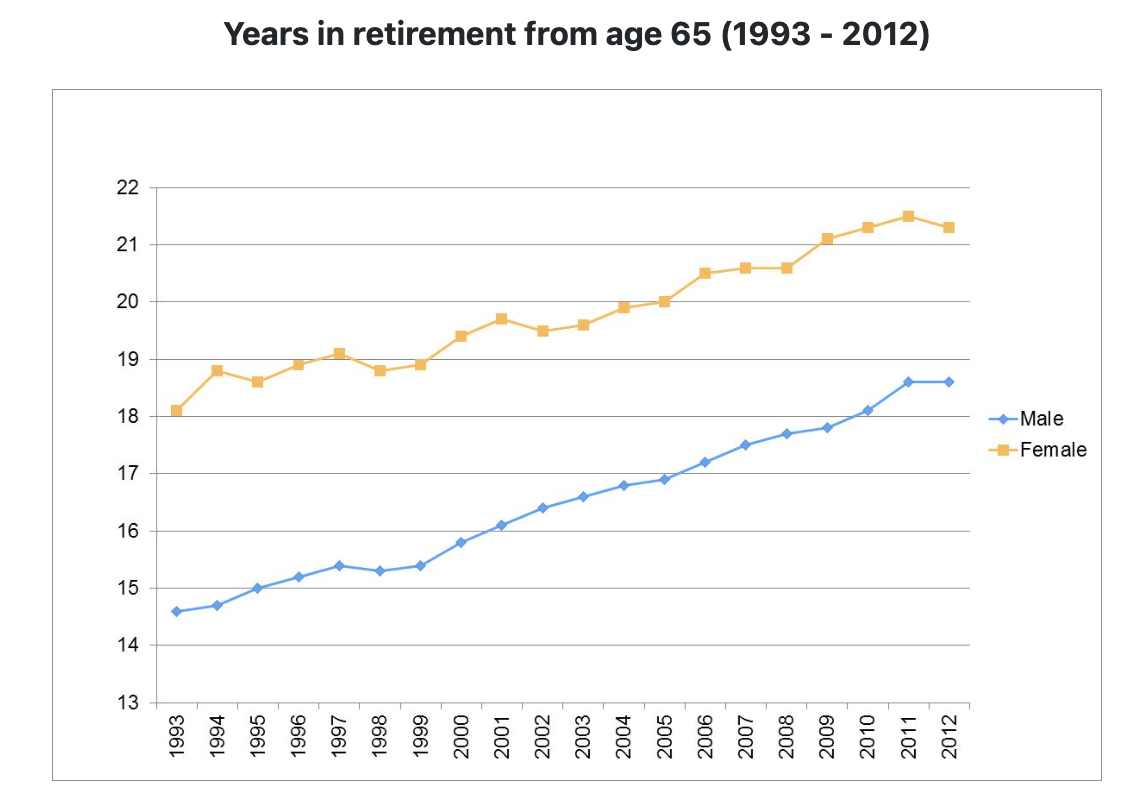 In this form the index clearly demonstrates how life expectancy in retirement has changed over time. It shows that life expectancy in retirement (measured from age 65) has increased from 14.6 years in 1993 to 18.6 years in 2012 for males and from 18.1 years in 1993 to 21.3 years in 2012 for females.