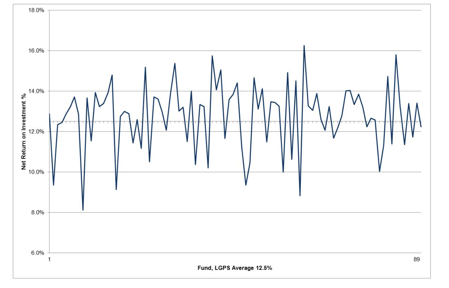 The above chart shows the distribution around 12.5%, with most funds falling in a range of between 9.0% and 15.5%.