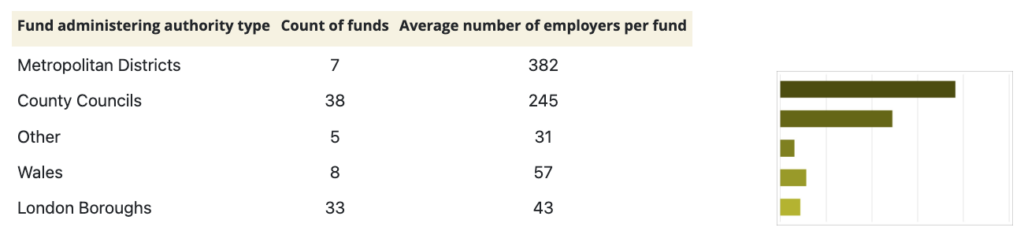 The chart shows how the average number of employers differs between the types of administering authority. County council administered funds typically have more participating employers compared with London boroughs. The ‘Other’ category comprises the London Pension Fund Authority, Transport Authorities and the Environment Agency funds.