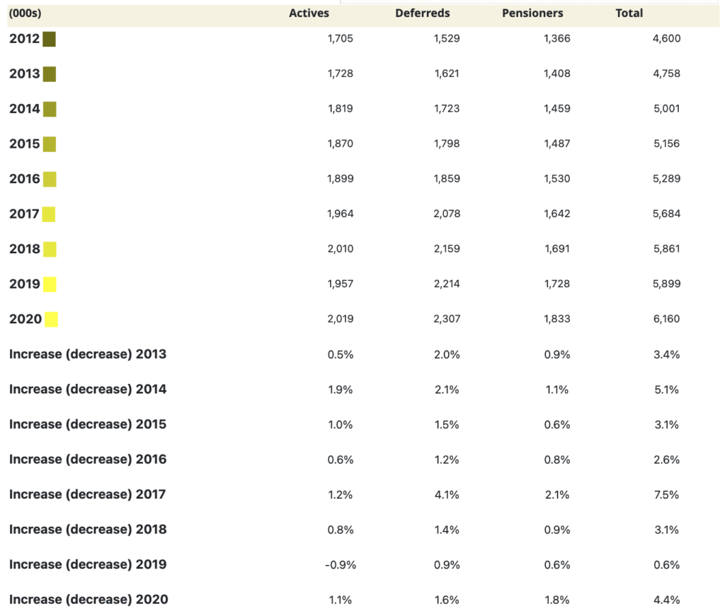 As at 31 March 2020, the total membership of the Scheme was 6.16million, compared with 5.89million as at 31 March 2019. The greatest increase in absolute and relative terms was to pensioner membership, which increased by 5.7% over the year to 2020.