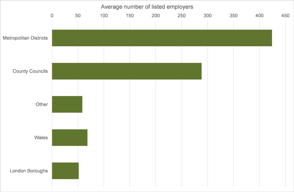 The chart shows how the average number of employers differs between the types of administering authority. County council administered funds typically have more participating employers compared with London boroughs. The ‘Other’ category comprises the London Pension Fund Authority and the Environment Agency funds (for the purpose of administration, City of London is included in London Boroughs).