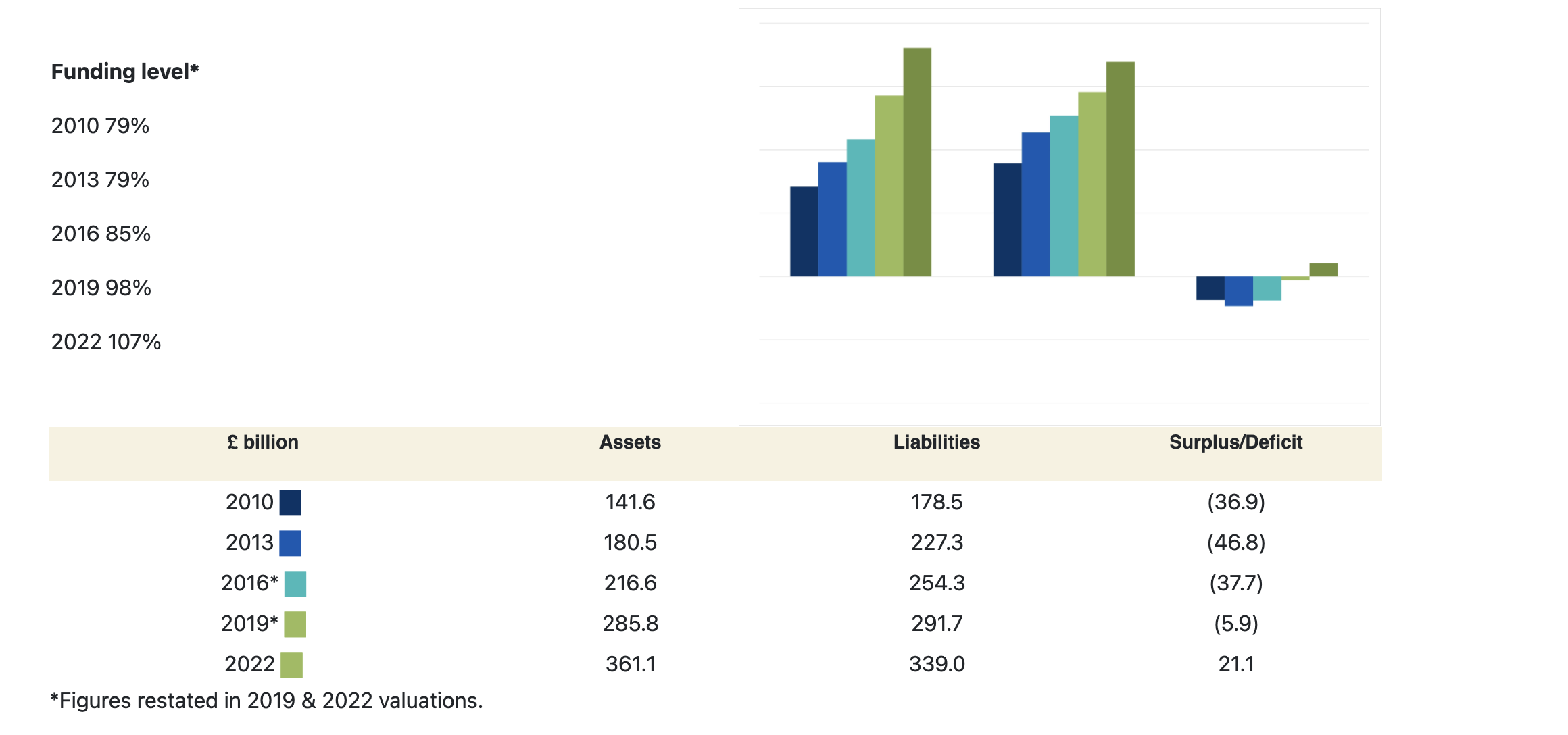 As at 31st March 2022, the analysis of the 2022 valuations reported assets of £361.1bn and liabilities on local funding assumptions of £339.0bn, i.e. a surplus of £22.1bn and a funding level of 107%. This is an overall improvement compared to the position in 2019 which showed assets of £285.8bn and liabilities of £291.7bn i.e. a deficit of £5.9bn and a funding level of 98%.