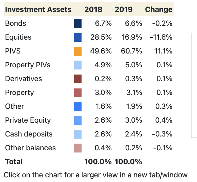 The latest year did not see a continuation of the dramatic reduction in equity exposure that had been in evidence in 2017/18 and high level asset allocation remained unchanged over the year as can be seen below.